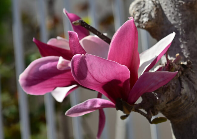 ハクモクレン(白木蓮)とシモクレン(紫木蓮)は、ともにモクレン科の落葉樹ですが、花色(白vs紫)、開花時期(3月上旬vs4月)、花の形(厚みのある椀状vs細長いスプーン状)が異なります。ハクモクレンは高木で花が先、シモクレンは低木で葉と花が同時に出るのが特徴です。